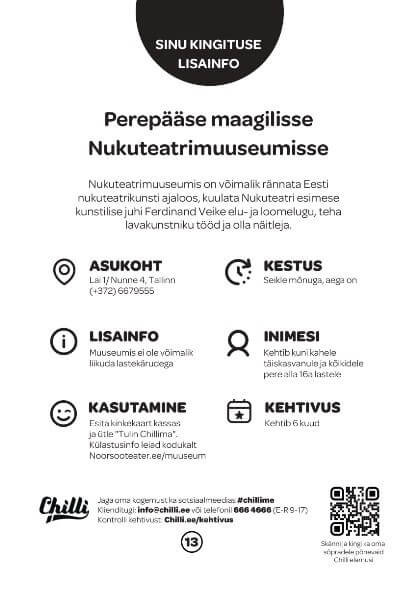 Nukketeatterimuseossa on mahdollista matkustaa Viron nukketeatteritaiteen historiaan, kuunnella Nukketeatterin ensimmäisen taiteellisen johtajan Ferdinand Veiken elämää ja luovuutta, tehdä lavastustyötä ja olla näyttelijä. Museossa voi leikkiä erilaisilla pienillä lavoilla ja kehittää omaa luovuutta sekä ilmaisutaitojaan.