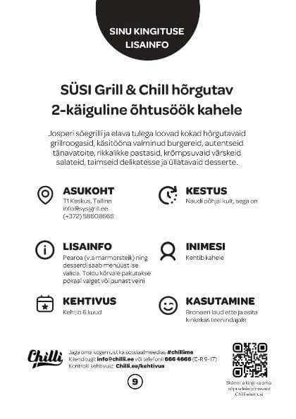 Предложение включает в себя гастрономические впечатления на сумму 55 € в гриль-ресторане SÜSI Grill & Chill.