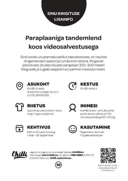 Pakkumine kehtib ühele adrenaliinikütile ja sisaldab paraplaaniga tandemlendu koos videosalvestusega